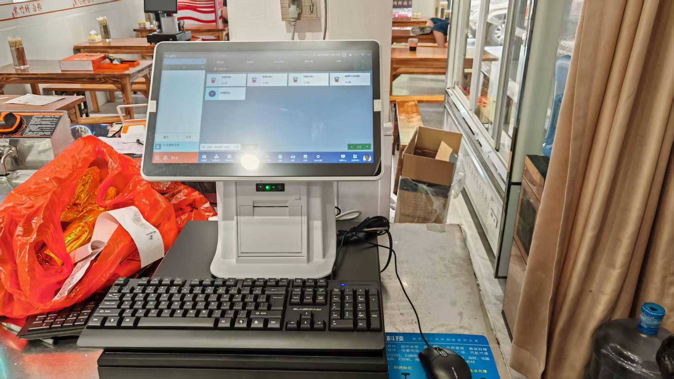 收銀設備采用觸屏收銀一體機搭配銀豹餐飲收銀系統(tǒng)解決方案,操作流程不卡頓,快餐早餐店首先